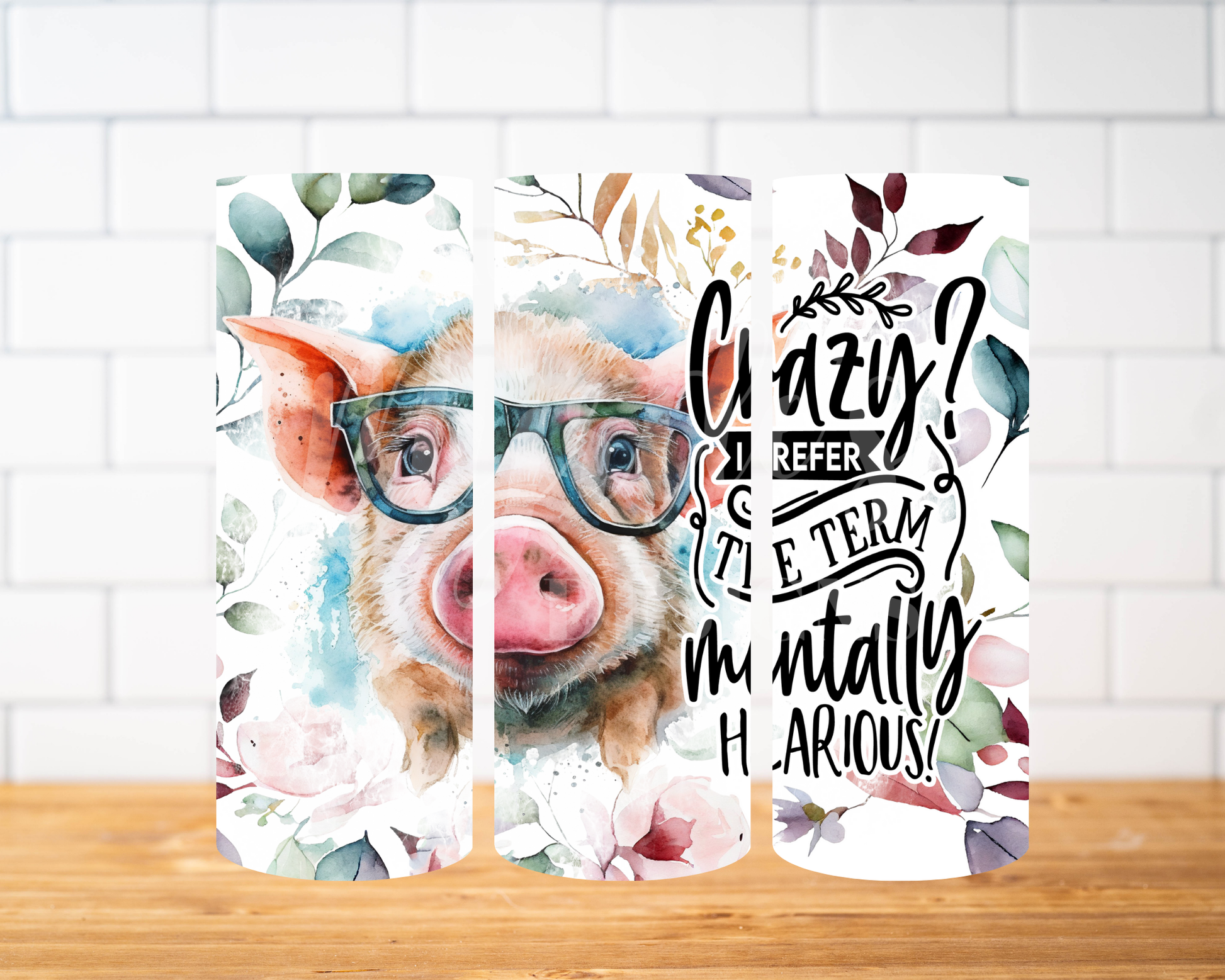 This 20oz stainless steel tumbler features a cute watercolor pig with big glasses, surrounded by soft floral accents. On the other side is the phrase, "Crazy? I prefer the term Mentally Hilarious!" with a whimsical, hand-lettered font. This tumbler is designed to keep your drinks at the perfect temperature for hours, and it comes with a secure lid and straw for easy sipping wherever you go.