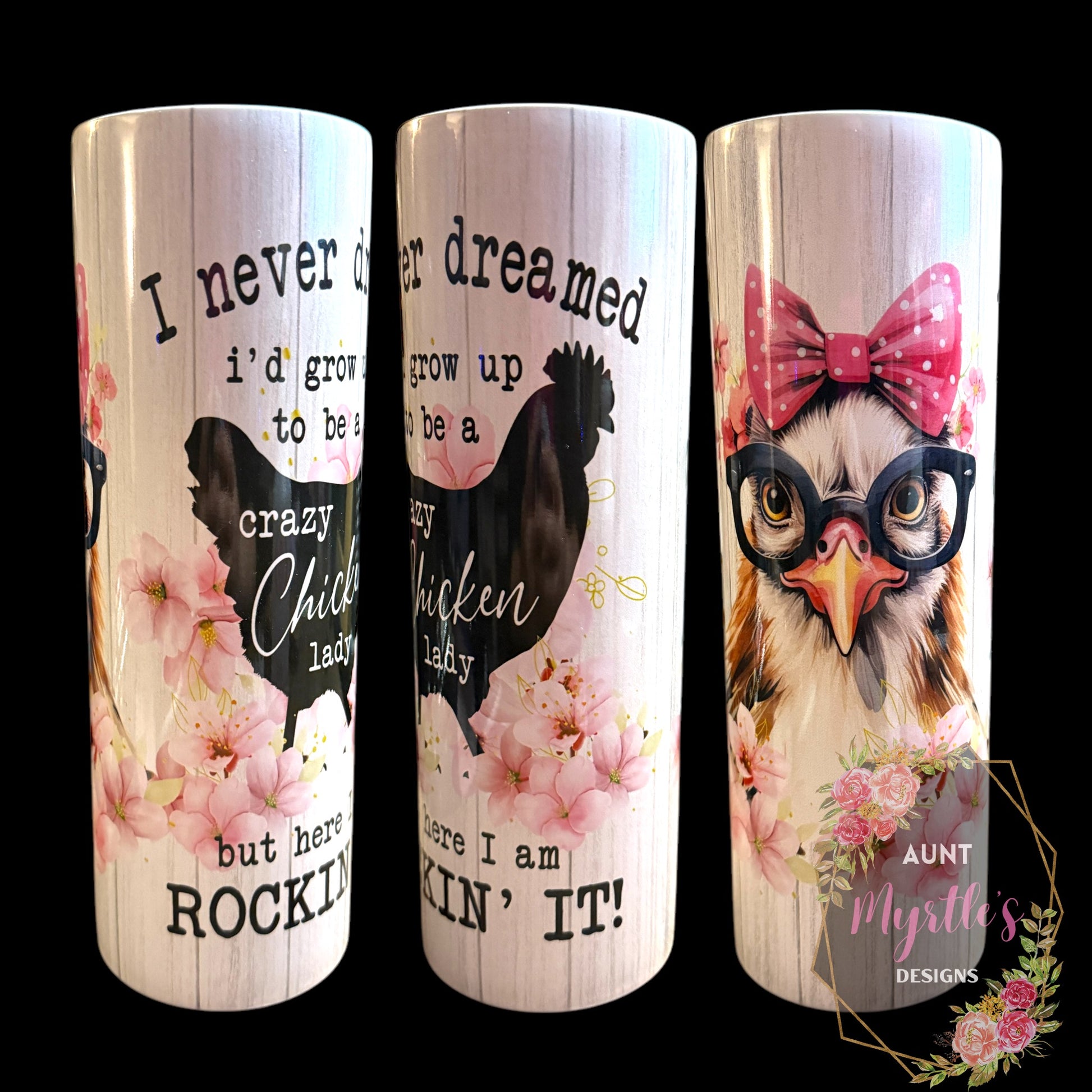 This 30oz stainless steel tumbler features a charming watercolor design. One side shows a stylish owl with a big pink bow and a pair of chic glasses, surrounded by soft pink florals. The other side has a silhouette of a chicken and the hilarious phrase, "I never dreamed I'd grow up to be a crazy chicken lady, but here I am rockin' it!" This tumbler is made to keep your beverages hot or cold for hours, and it comes with a lid and straw for easy, on-the-go use.