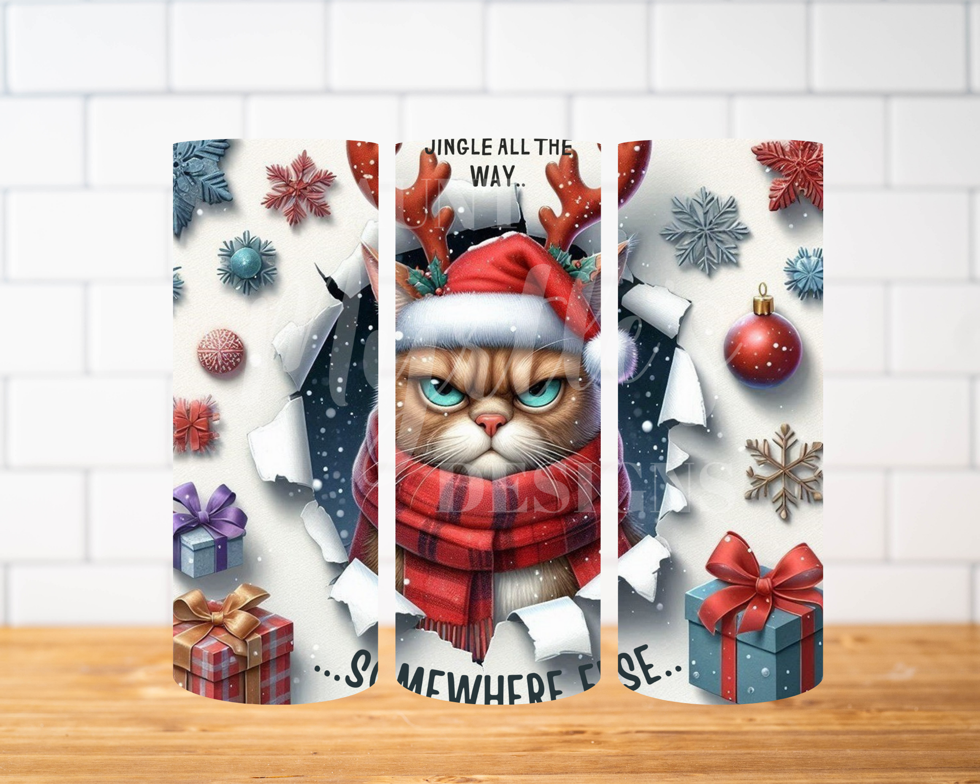 Not feeling the holly jolly spirit this year? This tumbler gets it. Featuring a hilariously grumpy cat dressed in full holiday gear — Santa hat, antlers, and all — this design perfectly captures the mood for anyone who loves Christmas… but in moderation. Surrounded by snowflakes, ornaments, and presents, it’s equal parts festive and funny.